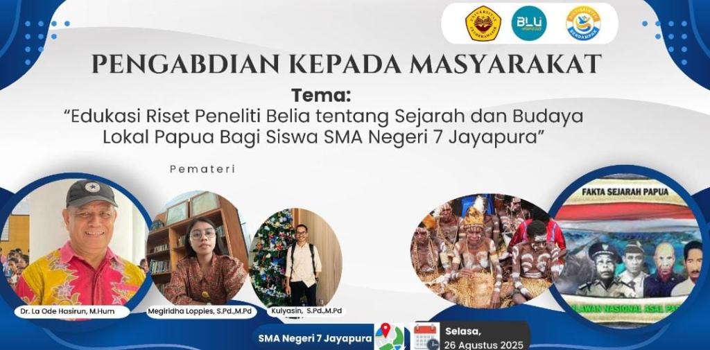 Jayapura – Tim dosen dari Program Studi Pendidikan Sejarah, Fakultas Keguruan dan Ilmu Pendidikan (FKIP) Universitas Cenderawasih melaksanakan kegiatan Pengabdian kepada Masyarakat (PKM) di SMA Negeri 7 Jayapura pada Selasa, 26 Agustus 2025. Kegiatan ini mengusung tema “Edukasi Riset Peneliti Belia tentang Sejarah dan Budaya Lokal Papua” dan diikuti oleh puluhan siswa yang memiliki minat dalam bidang sejarah dan budaya. Tim pengabdi terdiri dari Dr. La Ode Hasirun, M. Hum (ketua), Megiridha Loppies, S.Pd., M. Pd (anggota I), dan Kulyasin, S.Pd., M.Pd (Anggota II).